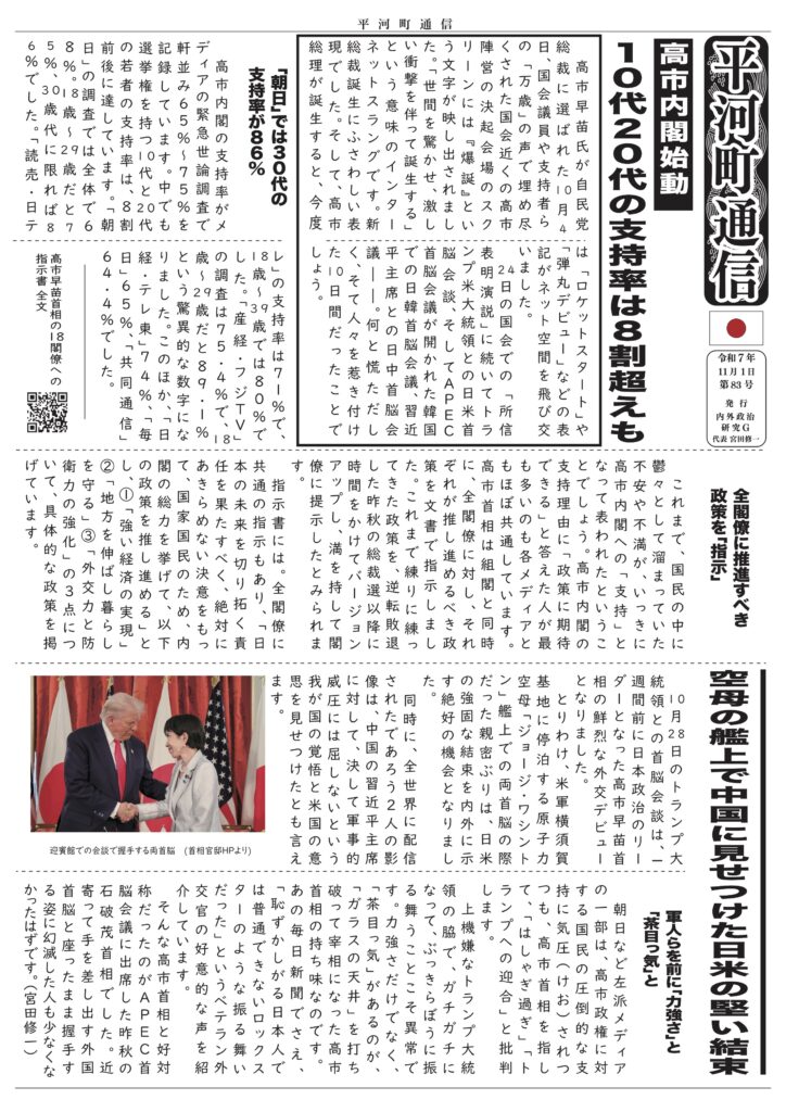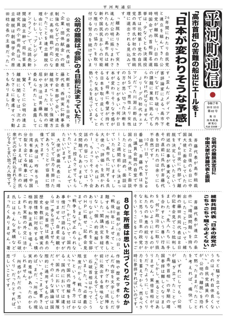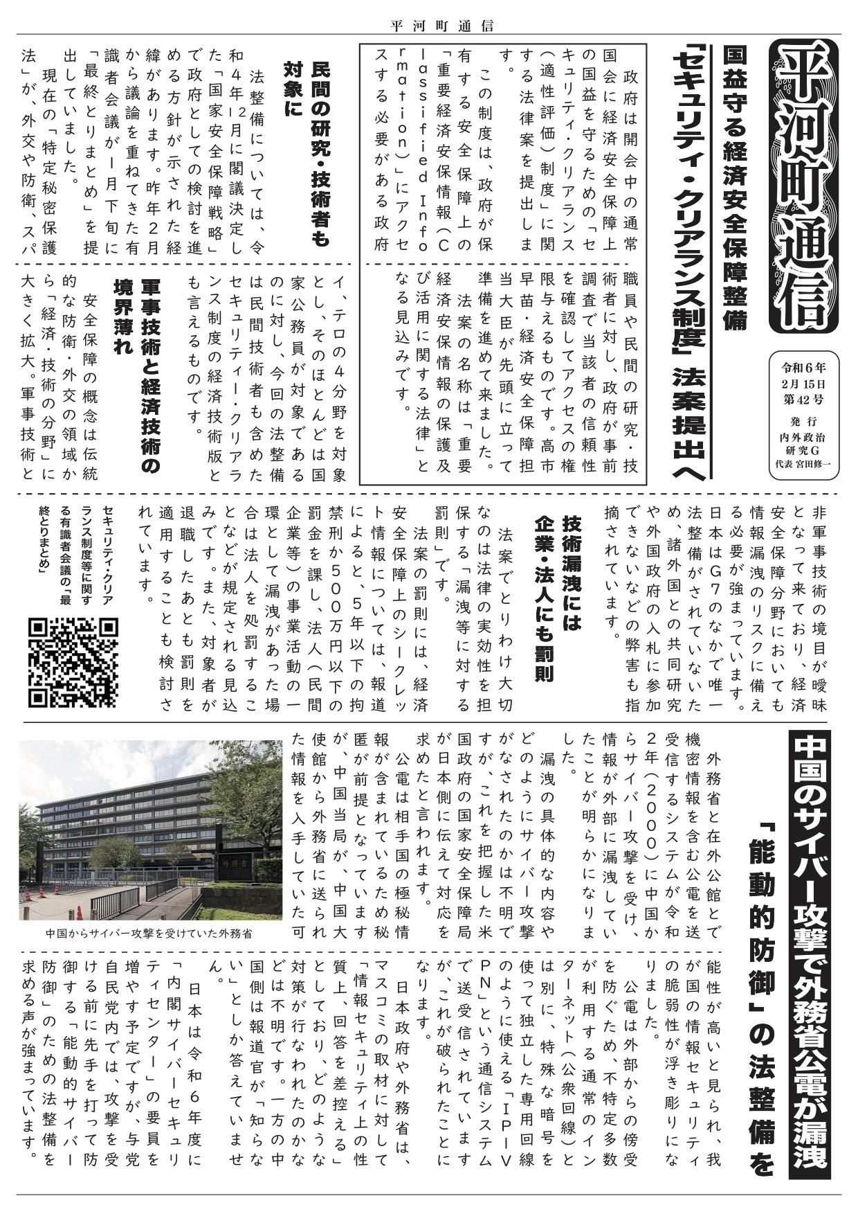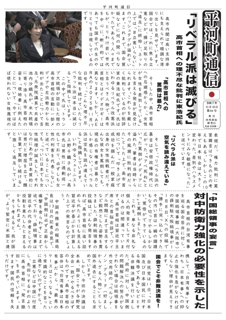 平河町通信 第10号 ー 守勢から転じ「国家意思」を示せ